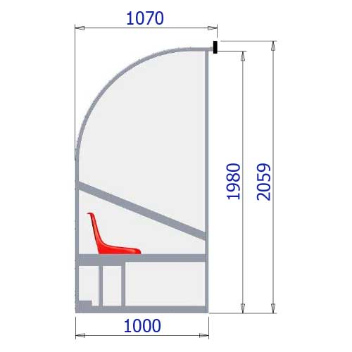Matériaux : Cadre en aluminium assemblé par soudure. Parois en polycarbonate de 3 mm d’épaisseur. Sièges baquet en polypropylène.