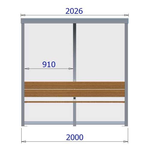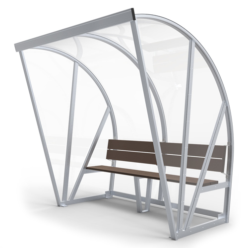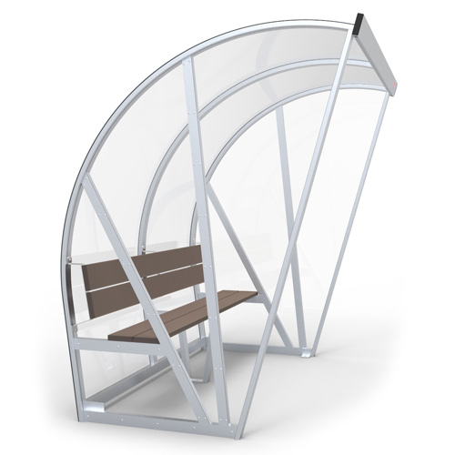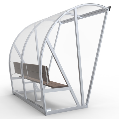 Matériaux : Cadre en aluminium assemblé par soudure. Parois en polycarbonate de 3 mm d’épaisseur. Lames de banc en bois composite.