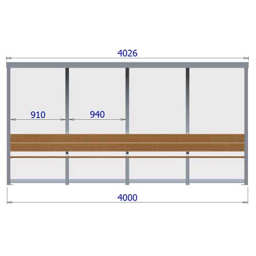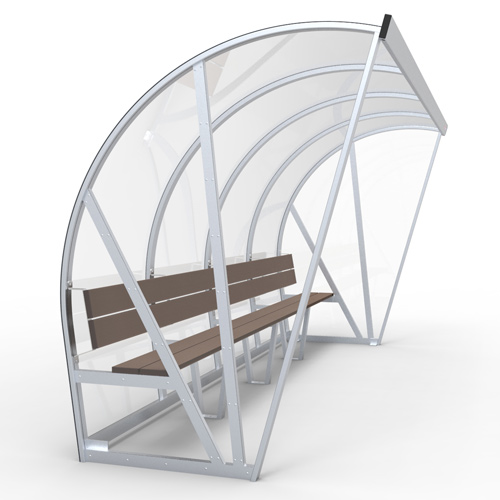 Matériaux : Cadre en aluminium assemblé par soudure. Parois en polycarbonate de 3 mm d’épaisseur. Lames de banc en bois composite.