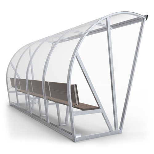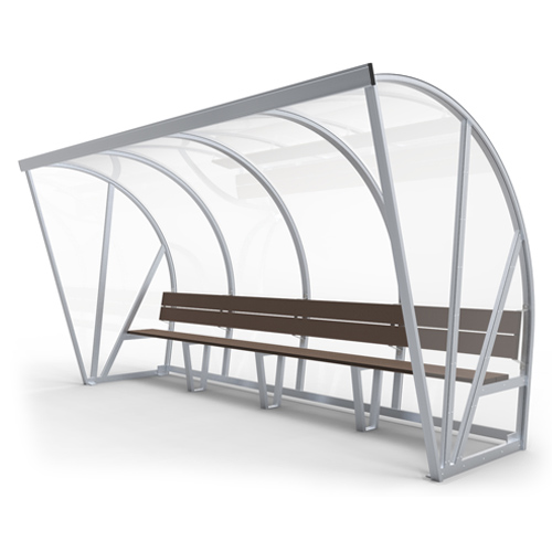 Banc de touche monobloc surmonté d’un toit en auvent, cet abri, pouvant accueillir jusqu’à 12 personnes, a été conçu et optim..