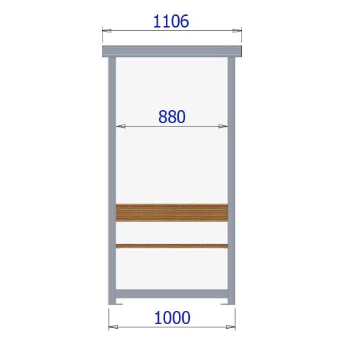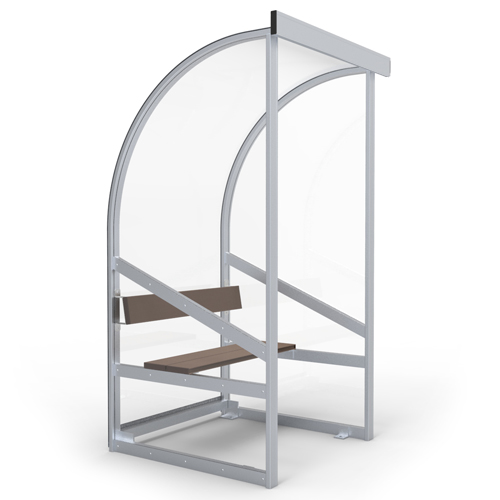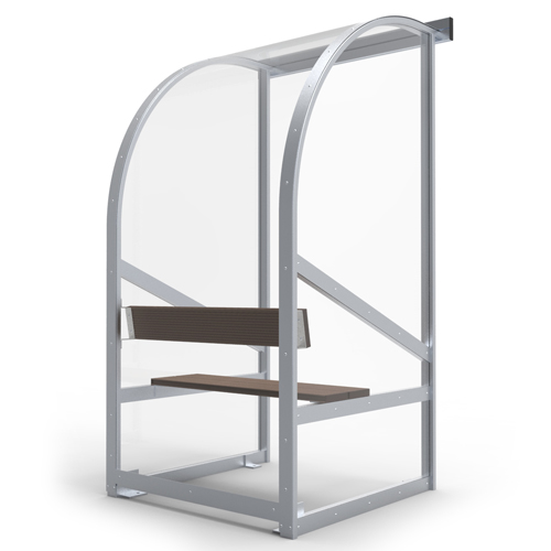 Matériaux : Cadre en aluminium assemblé par soudure. Parois en polycarbonate de 3 mm d’épaisseur. Lames de banc en bois composite.