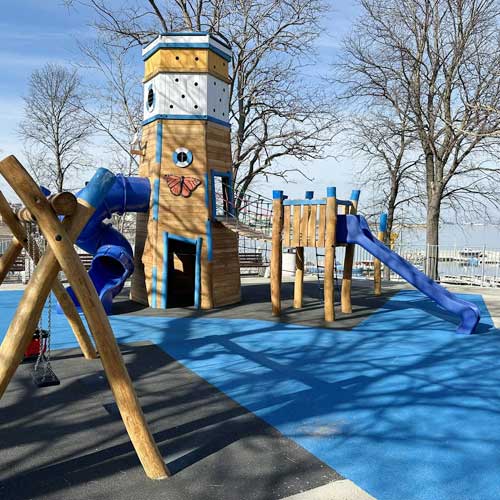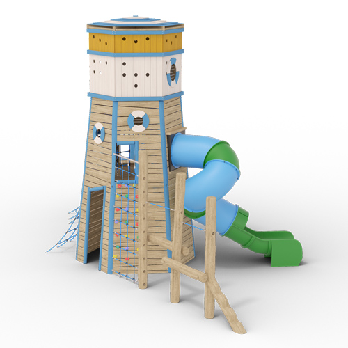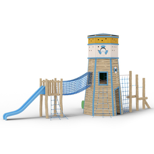 Structure pour aire de jeux sur le thème de la mer, faisant la part belle à l’imaginaire et à la créativité, le Phare des garde-côtes plonge les enfants dans un océan d’aventures et d’activités ludiques. Dans ce décor propice aux jeux de rôle et de simulation, les enfants s’imaginent en sentinelles des mers, guettant l’océan déchaîné sous la tempête, prêts à secourir les marins en détresse. Toboggans, paroi d’escalade, filets de grimpe, pont de corde… le Phare des garde-côtes offre aux enfants un large éventail d’activités mêlant éveil créatif et exercices physiques.