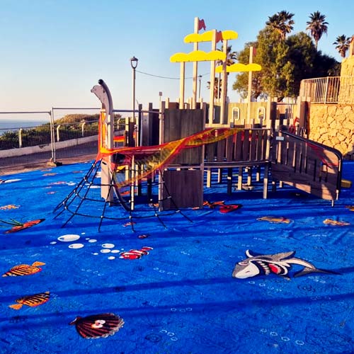 Gazon synthétique tufté, les différents motifs et illustrations de l’univers marin sont directement intégrés à la structure même du gazon. Contrairement à une simple impression en surface, la fabrication par tuftage permet d’obtenir une qualité de finition optimale tout en garantissant une excellente résistance à l’usure. La densité et la souplesse des fibres contribuent également à créer une texture de gazon artificiel particulièrement douce et agréable au toucher. Imputrescible et résistant aux variations climatiques, ce gazon thématique intègre un système de drainage performant permettant d’évacuer rapidement les eaux de pluie. Comme pour toute aire de jeux en gazon artificiel, la fonction de sol amortissant est assurée par la pose d’une sous‑couche amortissante (type Playbase, Ecopads…).